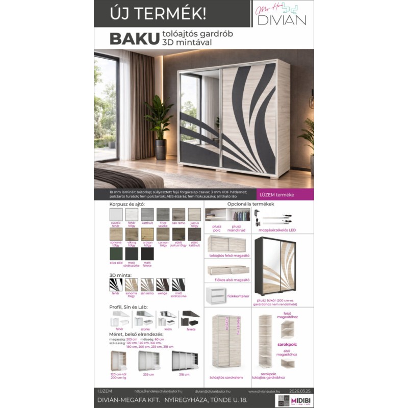 A Baku gardrób széles szín és méretválasztékkal igyekszik mindenki igényeinek megfelelni. A front 3D mintája 5 féle színben választható, mely szabadon variálható a számos korpusz színnel. Belső elrendezését tekintve teljesen személyre szabható, köszönhetően az akár egymásra is helyezhető fiókdobozoknak, polcoknak, mándlirudaknak. Opcionálisan választható termékek: – sarokpolc – tolóajtós sarokelem – fiókos alsó magasító – tolóajtós felső magasító. Az ajtók tükörrel is kérhetőek, ebben az esetben a tükör megkapja az ajtó 3D mintáját.